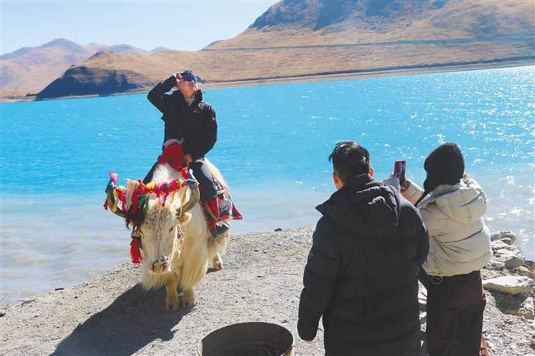 圖為近日在羊卓雍錯(cuò)岸邊,游客騎在牦牛上拍照打卡。記者 武沛濤 孫開遠(yuǎn) 攝