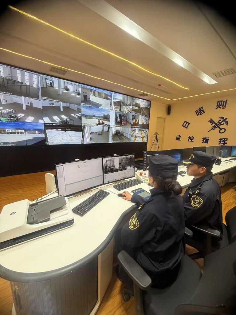 拉薩海關所屬日喀則海關關員在國際陸地港出口查驗場監(jiān)控指揮中心查看H986掃描貨物情況(圖為拉薩海關提供)
