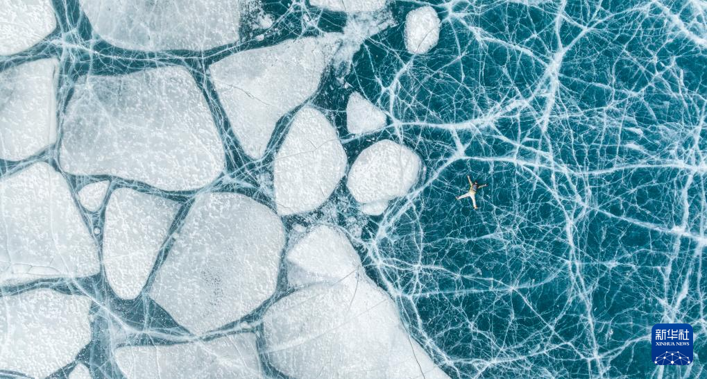一名游客躺在恰央錯結(jié)冰的湖面上拍照(1月26日攝,無人機(jī)照片)。新華社記者 丁增尼達(dá) 攝