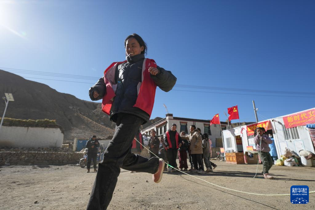 1月25日,在定日縣曲洛鄉(xiāng)熱木青村安置點,大學生志愿者在安置點和孩子們一起玩游戲。新華社記者 晉美多吉 攝??