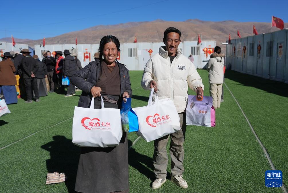 1月27日,拉孜縣加嘎村安置點受災群眾領到新年大禮包。新華社記者 晉美多吉 攝