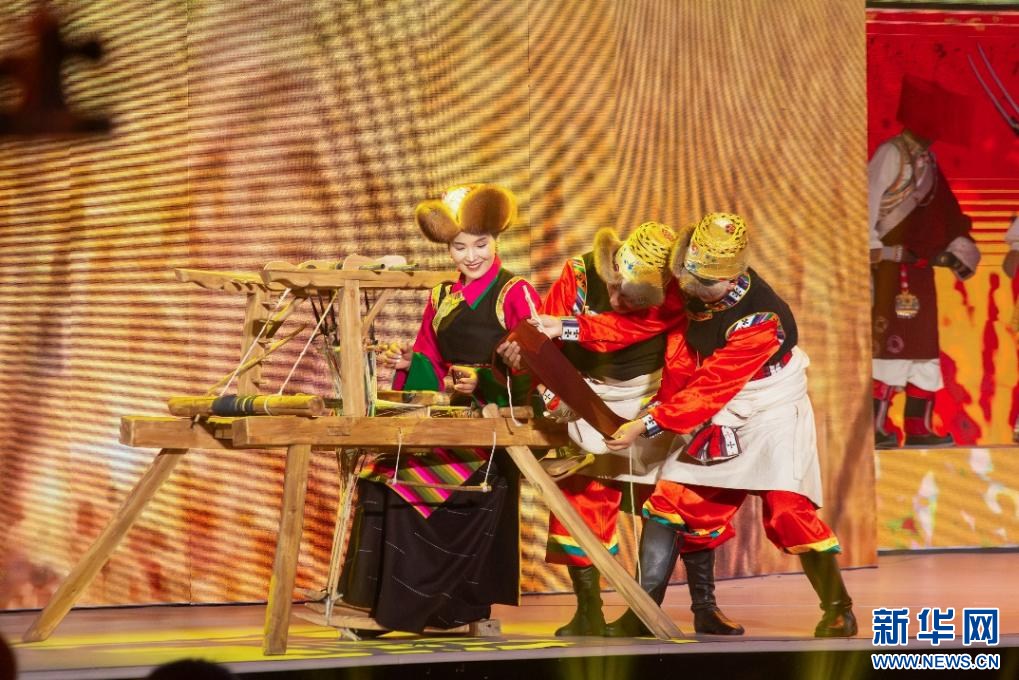 拉薩市2025年春節(jié)藏歷“木蛇”新年聯(lián)歡會錄制現(xiàn)場,演員在表演藏式織布技藝(2月14日攝)。新華網(wǎng)發(fā) 龍杰明 攝