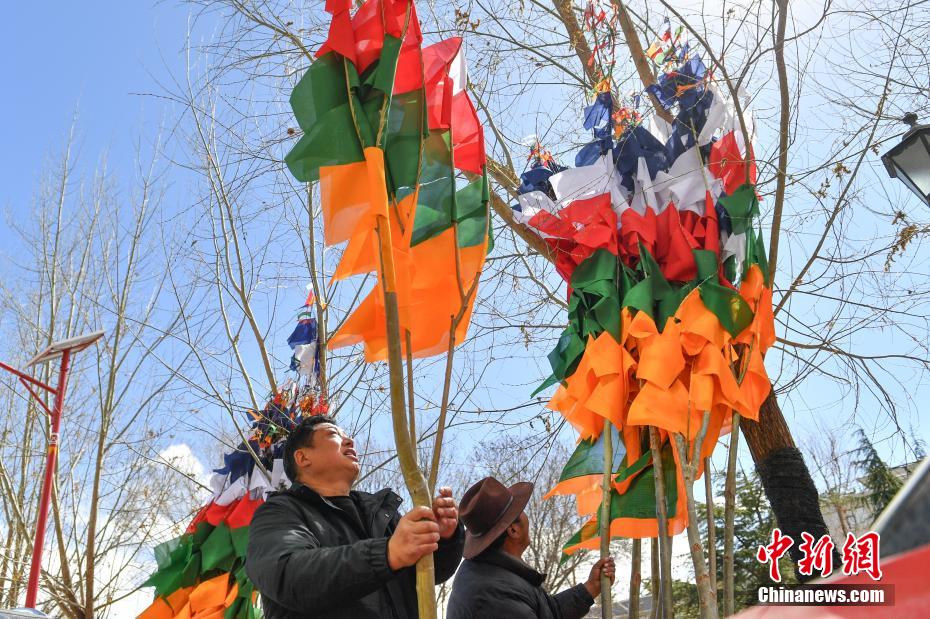 臨近藏歷新年,2月16日,在西藏拉薩街頭,農(nóng)牧民正縫制五彩經(jīng)幡樹。五彩經(jīng)幡樹是藏族民眾在藏歷新年前必備的年貨之一。藏歷新年期間,藏族民眾會選擇一個良辰吉日,為自家的房頂更換五彩經(jīng)幡樹,祈求新的一年里五谷豐登,吉祥如意。圖為2月16日,縫制完成的五彩經(jīng)幡樹。貢確 攝
