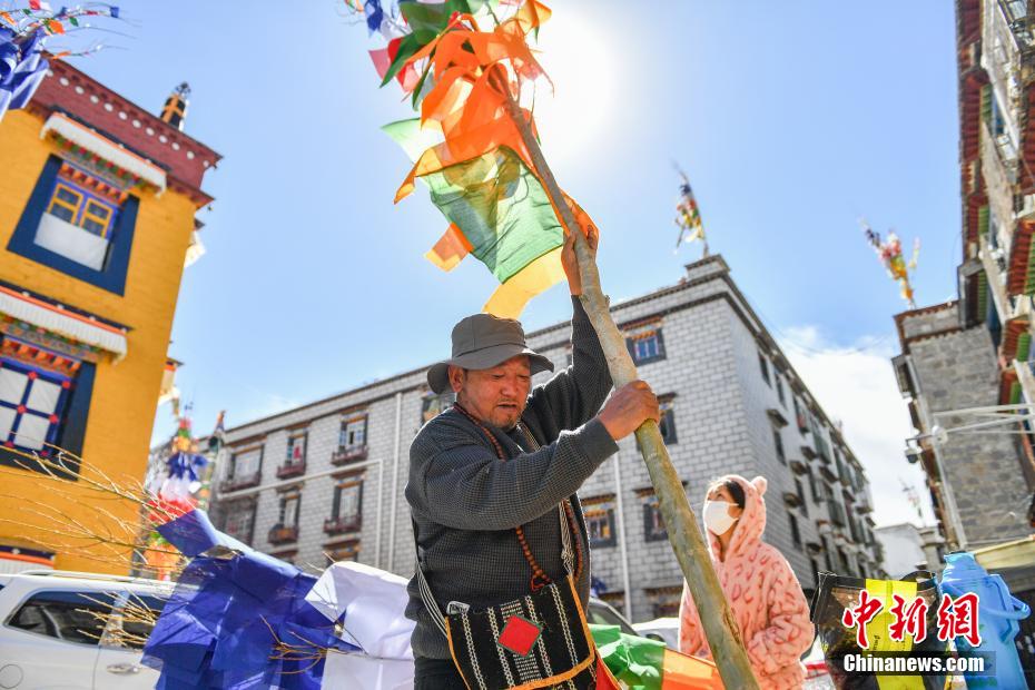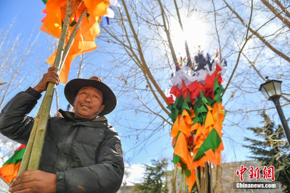 臨近藏歷新年,2月16日,在西藏拉薩街頭,農(nóng)牧民正縫制五彩經(jīng)幡樹。五彩經(jīng)幡樹是藏族民眾在藏歷新年前必備的年貨之一。藏歷新年期間,藏族民眾會選擇一個良辰吉日,為自家的房頂更換五彩經(jīng)幡樹,祈求新的一年里五谷豐登,吉祥如意。圖為2月16日,頓珠扛著五彩經(jīng)幡樹。貢確 攝