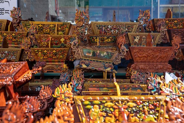 “老板,這個切瑪盒多少錢?便宜點我就拿走了?!薄斑@個圖案樣式都是精心雕刻的,最低1300元,實在不能再少了?!贝稳实牡赇伹?,不少顧客正在挑選“切瑪盒”,生意很是火爆?!扒鞋敽小笔菍⒕贫沸文竞杏酶舭宸珠_,左右兩邊分別盛入炒青稞和糌粑,再插上象征五谷豐登的“羅薩梅朵”和寓意吉祥的酥油花,寓意人壽年豐、吉祥如意,是藏歷新年家家戶戶必備的年貨之一。次仁告訴記者,“切瑪盒”根據(jù)圖案、顏料、大小、木材等因素,售價從幾百元到上千元不等,很多顧客普遍喜愛傳統(tǒng)樣式與圖案。