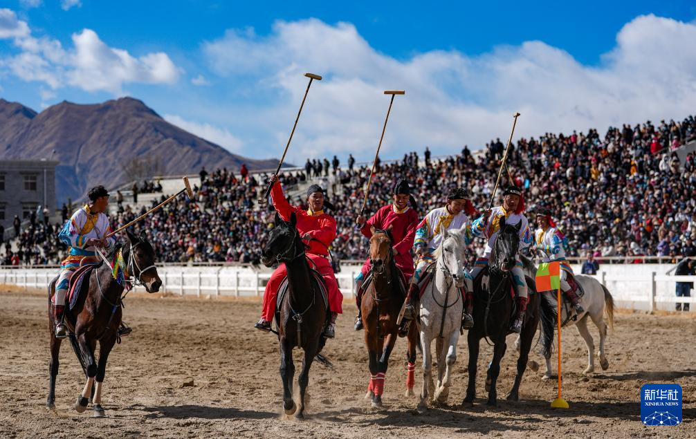 3月2日,馬術(shù)隊(duì)員在重現(xiàn)馬球比賽場(chǎng)景。新華社記者 晉美多吉 攝