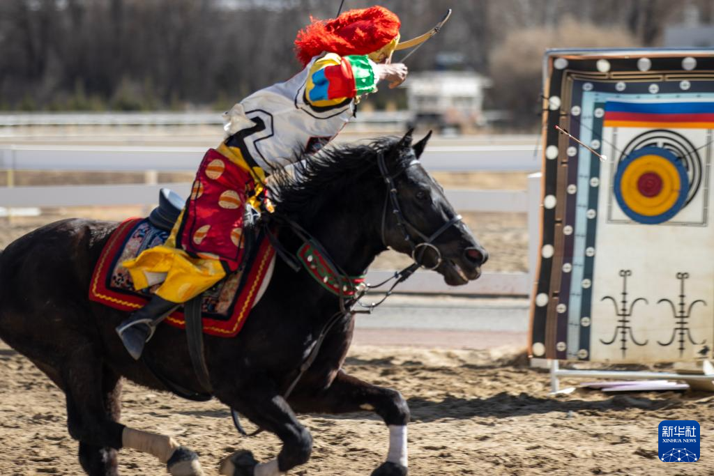 3月2日,馬術(shù)隊(duì)員在表演傳統(tǒng)馬術(shù)項(xiàng)目馬上射箭。新華社記者 晉美多吉 攝??