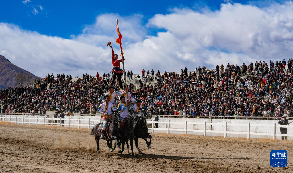 3月2日,馬術(shù)隊(duì)員在表演傳統(tǒng)馬術(shù)項(xiàng)目。新華社記者 晉美多吉 攝??