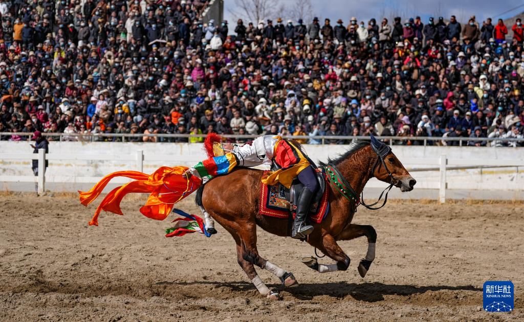 3月2日,馬術(shù)隊(duì)員在表演傳統(tǒng)馬術(shù)項(xiàng)目撿哈達(dá)。新華社記者 晉美多吉 攝?