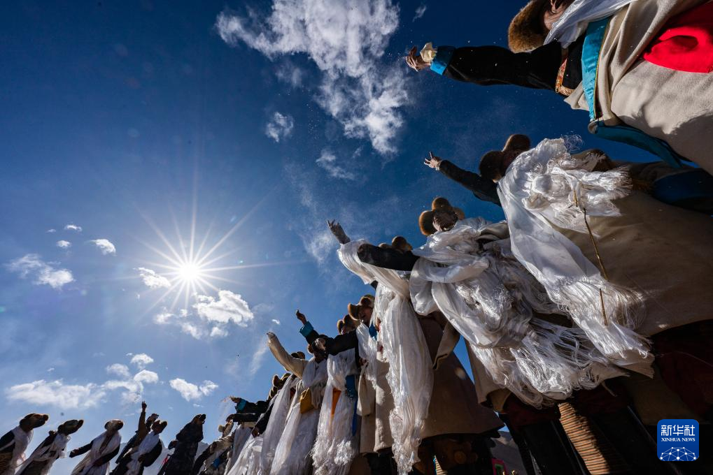 3月16日,在拉薩市林周縣春堆鄉(xiāng)春耕典禮現(xiàn)場,農(nóng)機駕駛員向天空撒糌粑祈愿豐收。新華社記者 丁增尼達 攝