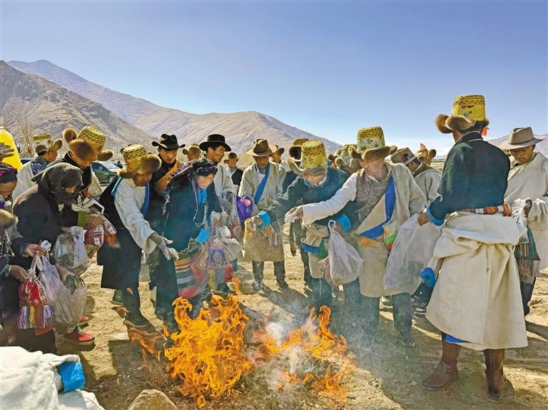 南木林縣卡孜鄉(xiāng)卡孜村春耕春播儀式上,群眾進(jìn)行煨桑儀式。