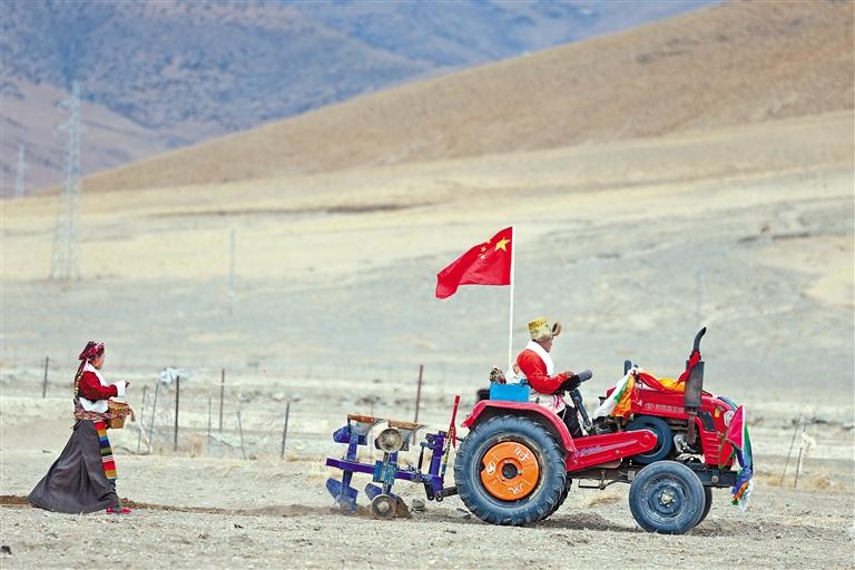 薩嘎縣春耕春播儀式上,村民開著拖拉機(jī)在前犁地,婦女在后撒青稞種子?! ?/p>