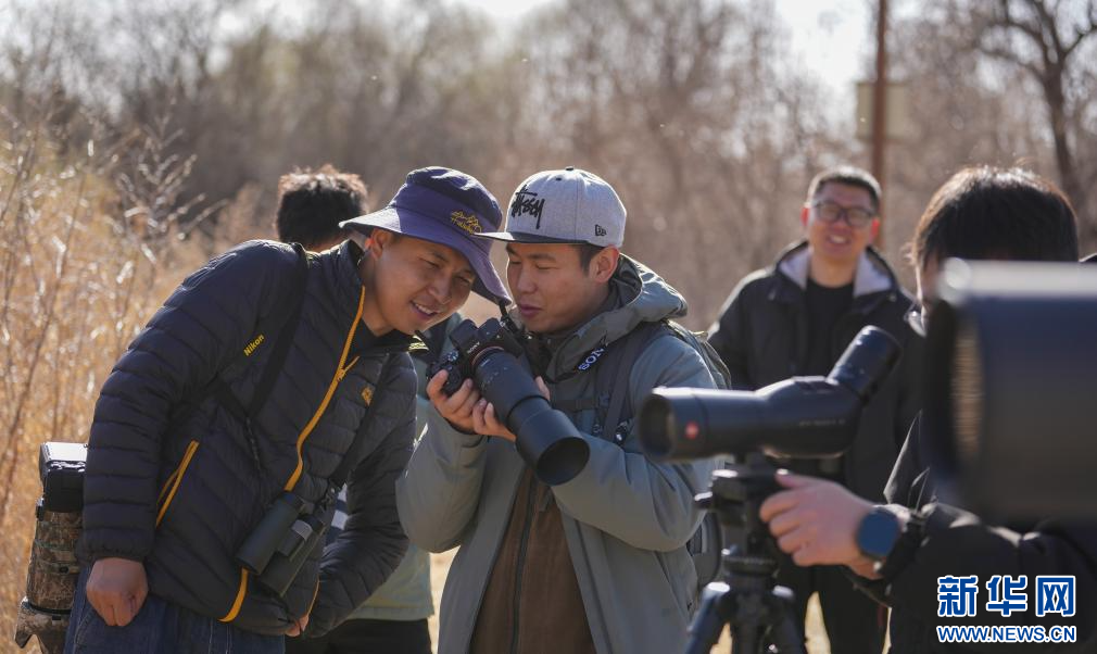 3月29日,參加采風(fēng)活動(dòng)的成員在拉魯濕地觀鳥(niǎo)拍照。(新華社記者 晉美多吉 攝)