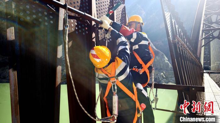 圖為加查路橋維修工區(qū)橋隧工檢查藏木雅魯藏布江雙線特大橋上的螺栓。貢桑拉姆 攝