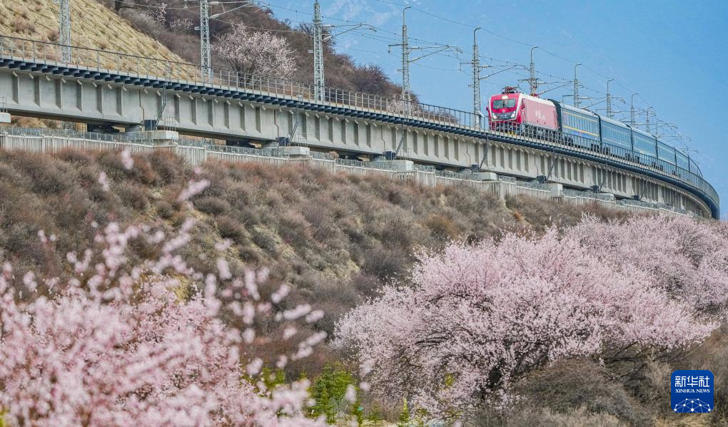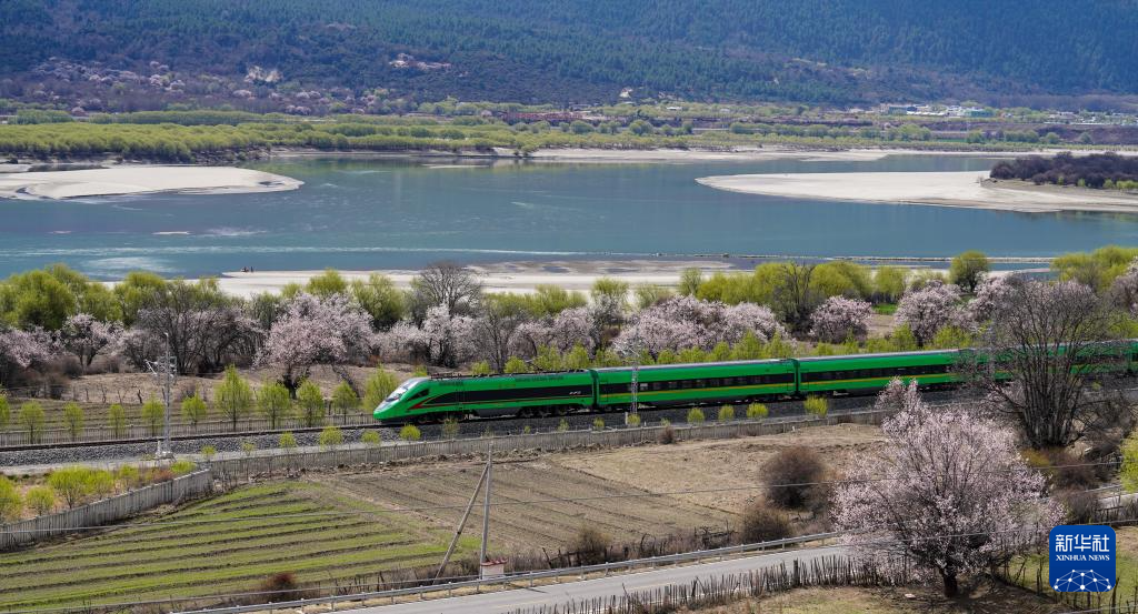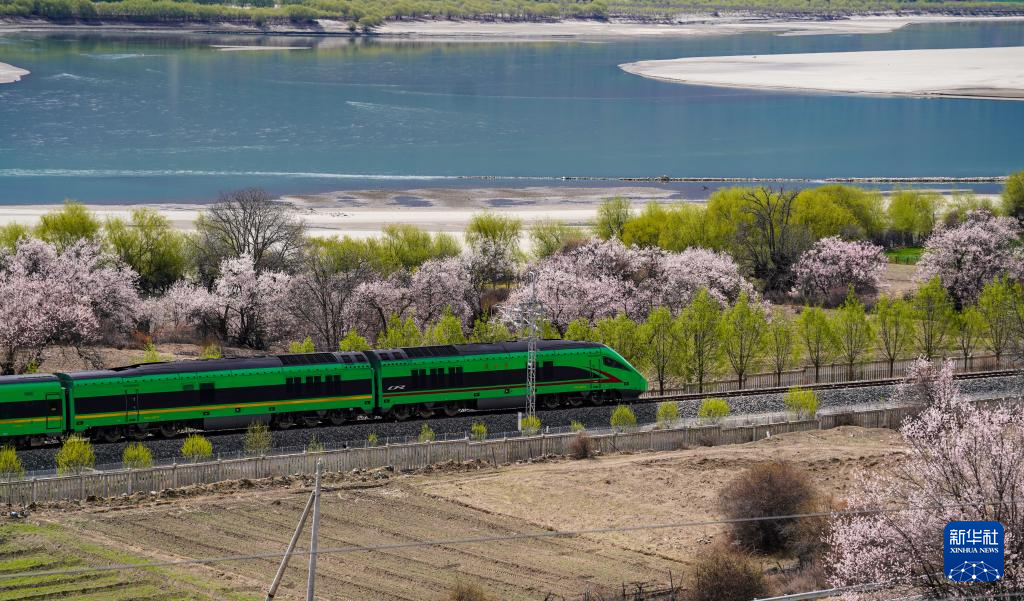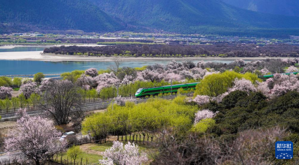 四月,藏東南河谷桃花初綻,車窗外雪山與桃林交相輝映,拉林鐵路列車穿行在桃花掩映的尼洋河畔,繪就高原獨有的春之畫卷。
