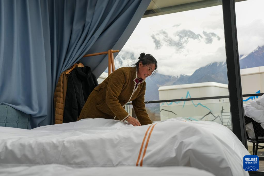 4月4日,林芝索松村一家民宿的服務員在整理房間。新華社記者 晉美多吉 攝