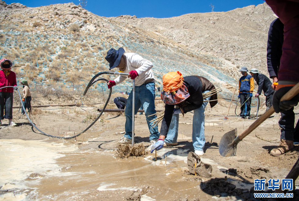 4月24日,在拉薩南北山造林綠化(貢嘎段)西藏森拓雅公司造林片區(qū),當(dāng)?shù)卮迕裨谠詷?shù)。新華網(wǎng) 旦增努布 攝