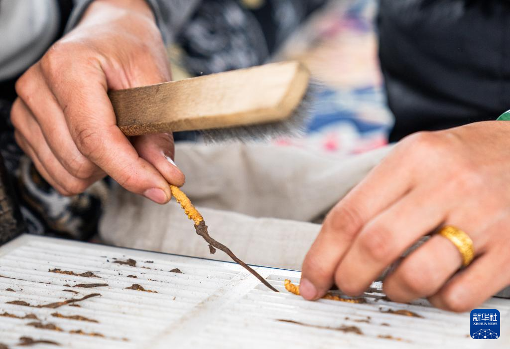 在那曲市索縣西昌鄉(xiāng),牧民白嘎在收納清理好的蟲草(5月18日攝)。新華社記者 丁增尼達 攝