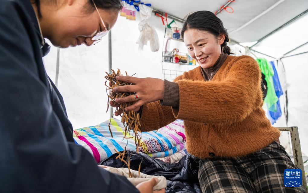 在那曲市索縣西昌鄉(xiāng),牧民將清理好的蟲草裝袋收納(5月18日攝)。新華社記者 丁增尼達 攝 ??