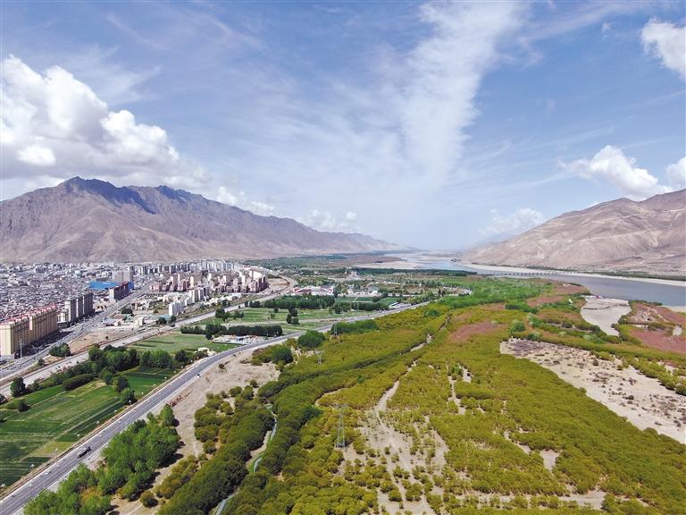 配圖:雅江中游“百里綠色生態(tài)長廊”與日新月異的山南市區(qū)和諧共生,展現(xiàn)出高原獨有的生態(tài)之美(無人機照片)。記者 武沛濤 攝