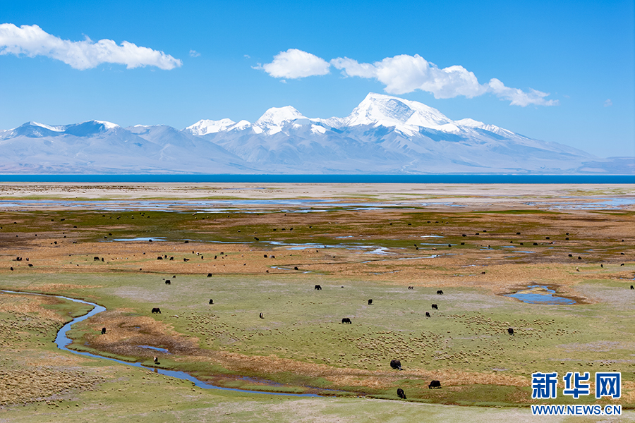 遠處的瑪旁雍錯與濕地內(nèi)覓草的牦牛(6月9日攝,無人機照片)。新華網(wǎng) 旦增努布 攝