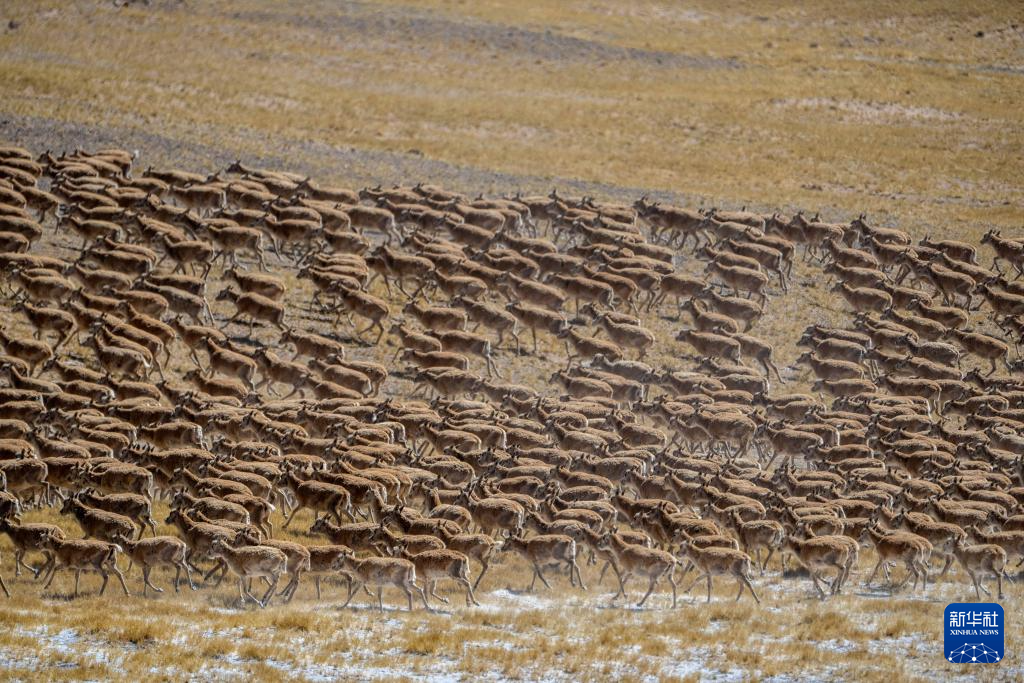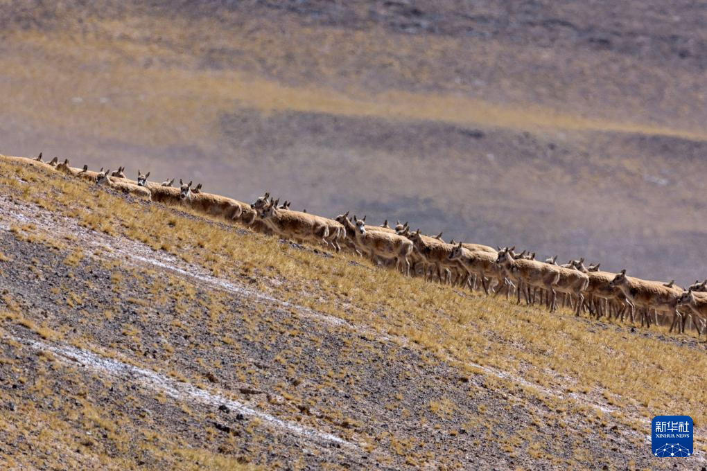 在羌塘國家級自然保護區(qū)核心區(qū)拍攝的遷徙中的雌藏羚羊群(6月9日攝)。新華社記者 旦增尼瑪曲珠 攝 ??
