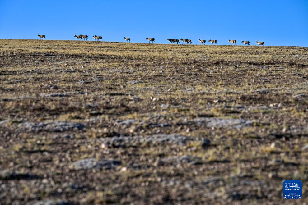 一群雌性藏羚羊在羌塘國家級自然保護區(qū)核心區(qū)內(nèi)進行繁殖遷徙(6月9日攝)。新華社記者 劉金海 攝 ??
