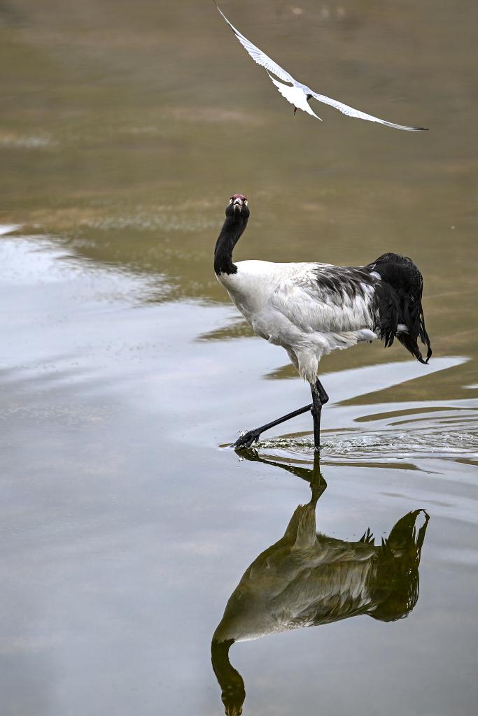 在西藏那曲市申扎縣,一只黑頸鶴試圖驅(qū)趕鳥(niǎo)巢附近活動(dòng)的漁鷗(2025年6月4日攝)。新華社記者 孫瑞博 攝