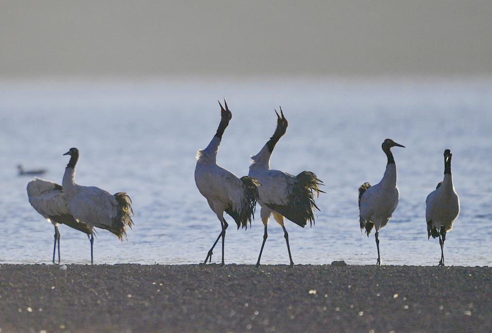 這是清晨在拉薩市林周縣虎頭山水庫(kù)拍攝的越冬黑頸鶴。西藏拉薩市林周縣位于拉薩河上游及澎波河流域,平均海拔約4200米,是黑頸鶴主要的越冬地之一(2023年12月5日攝)。新華社記者 姜帆 攝