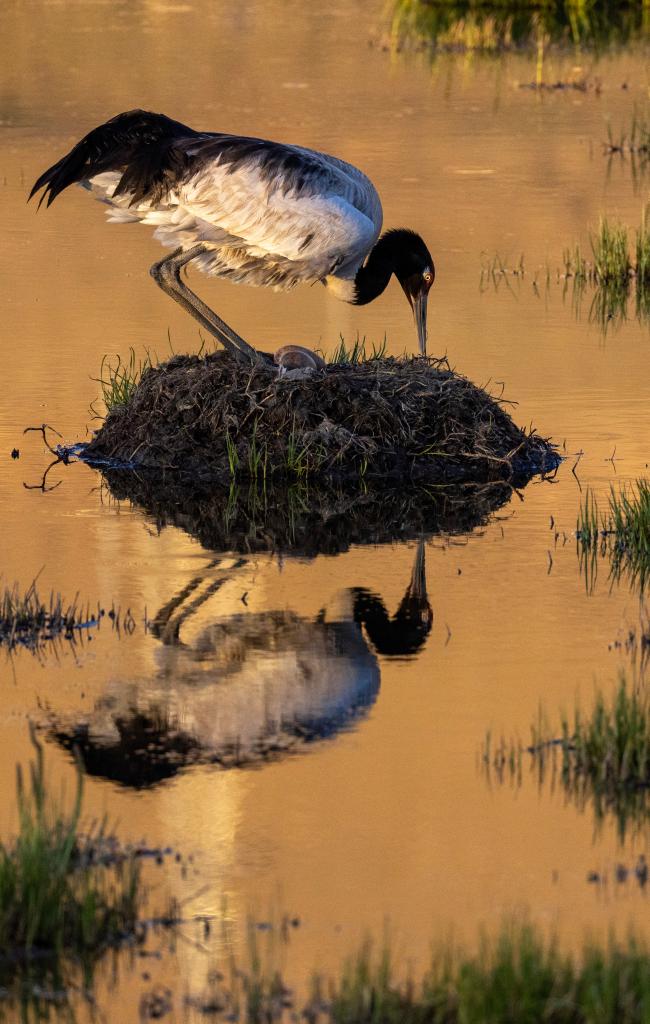 黑頸鶴在那曲市申扎縣申扎藏布濕地孵蛋(2024年6月7日攝)。新華社記者 姜帆 攝