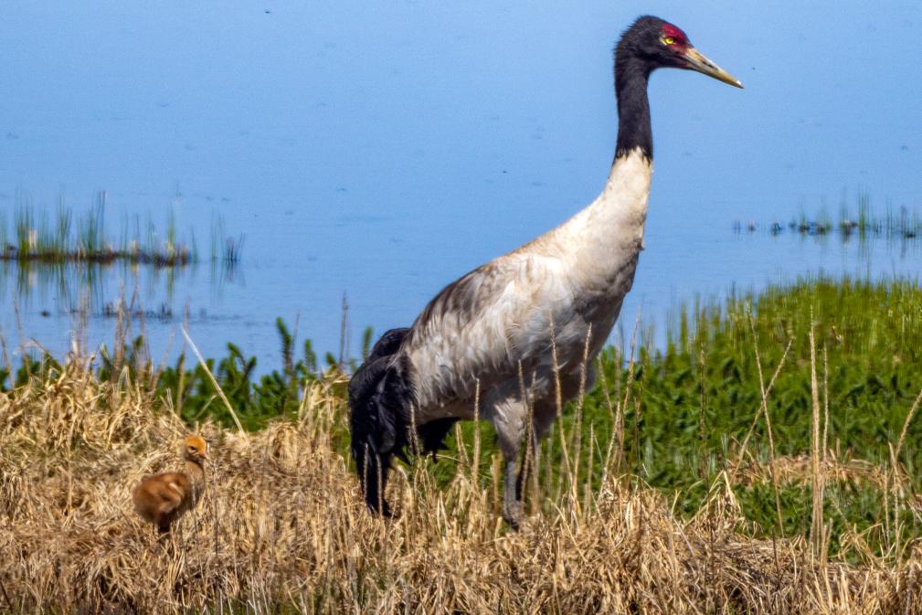 一只黑頸鶴在西藏那曲市申扎縣的申扎藏布濕地上照顧剛出殼的雛鳥(niǎo)(6月5日攝)。 新華社記者 姜帆 攝