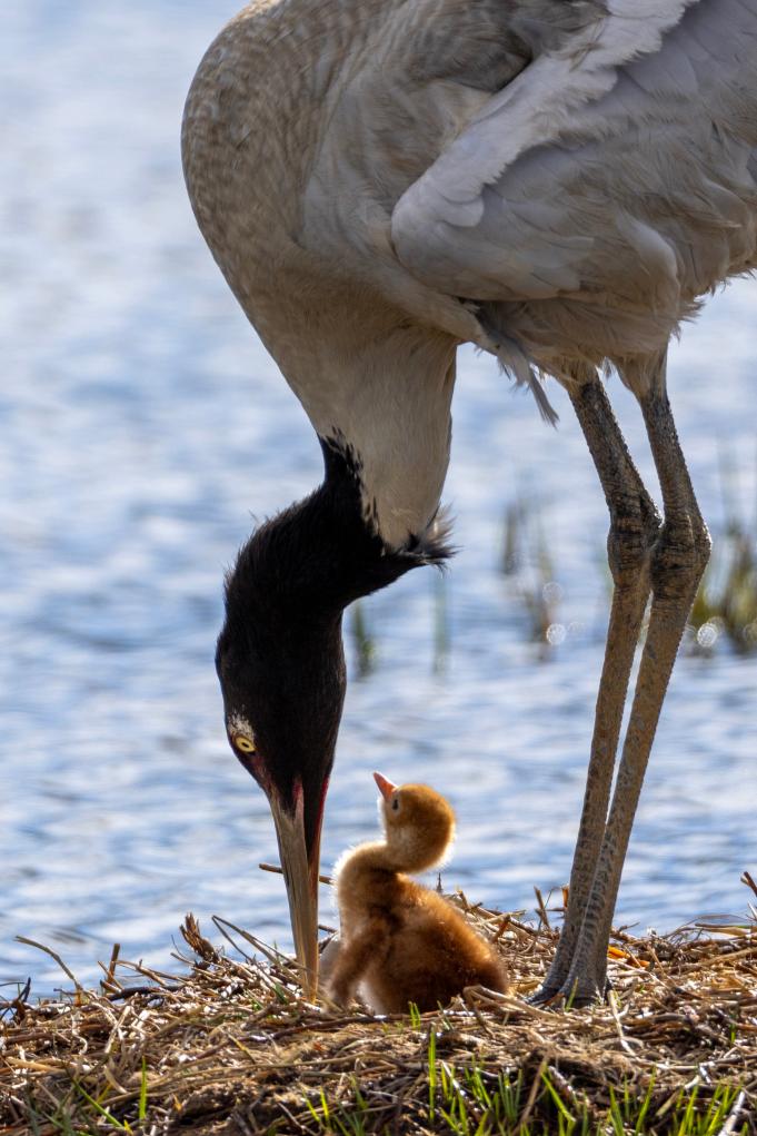 資料記載,黑頸鶴壽命大約為10到15年,通常一生中只有一個(gè)配偶;繁殖期在每年的5月至7月,求偶時(shí)伴隨著舞動(dòng)與共鳴——雙雙把頭伸向前方,彼此呼應(yīng)并發(fā)出“咯咯咯”的響聲,這一行為相當(dāng)于每年一次的“求婚”儀式。黑頸鶴營(yíng)巢于水環(huán)繞的草墩上或茂密的蘆葦叢中,一窩卵通常有2枚。