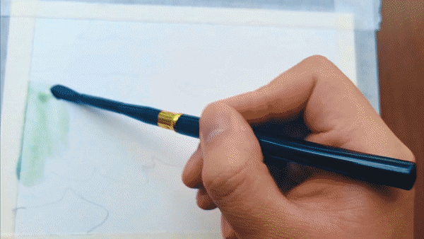 展開畫紙,最先捕捉到的是夏日魯朗層次豐富的綠意:嫩綠的草地鋪展開來,湖水映出清澈的藍(lán)綠色澤,遠(yuǎn)處的山巒泛著淡淡青色,層層疊疊。道路在明媚的陽光下,潔白如雪,在綠色中蜿蜒,串聯(lián)起一個個藏式村落。