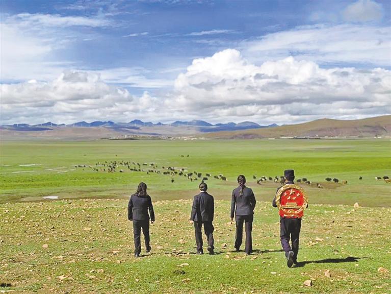 在廣袤的草原深處,牧民群眾的黑帳篷與成群的牛羊構(gòu)成人與自然和諧共生的畫卷。措美縣人民法院干警來到放牧點,圍坐于牧民群眾間,用通俗易懂的語言打開話匣子。“大叔,您看這草場上的植被,要是過度放牧,來年就長不出這么好的草了,牛羊沒了口糧,咱們的日子也受影響不是?”