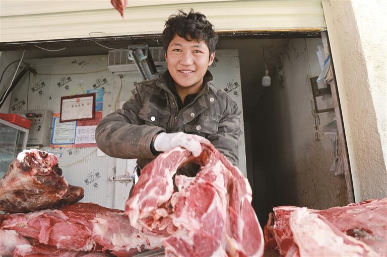 “我家有30多頭牦牛,今天拉來兩頭牦牛的肉來售賣,價(jià)錢也很理想,每年冬天我們都會賣一兩個牦牛的肉來提高家庭收入?!闭跀偽磺懊β档哪撩駨?qiáng)巴頓珠一邊麻利地切割牛肉,一邊笑著說道。他的皮卡車就停在攤位旁,車廂里放著牛肉,前來選購的消費(fèi)者絡(luò)繹不絕。
