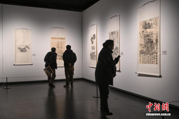 圖為觀眾欣賞展覽中的巖畫石刻拓片作品。中新社記者 貢嘎來松 攝