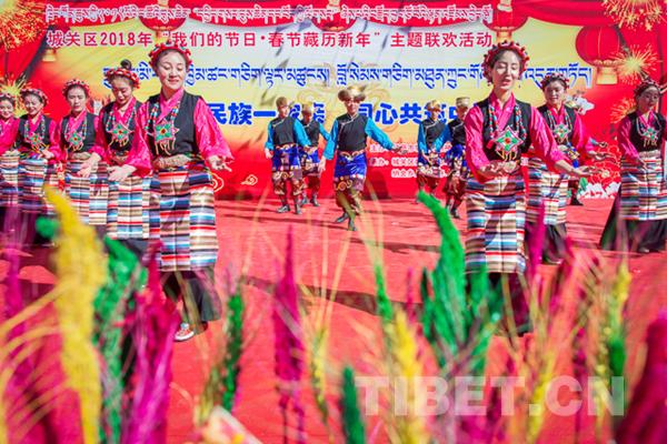 中國西藏網訊 2月8日上午,拉薩市城關區(qū)藏熱社區(qū)張燈結彩,彩旗飄揚,2018年“我們的節(jié)日o春節(jié)藏歷新年”主題聯(lián)歡活動拉開帷幕,來自城關區(qū)的雪巴拉姆民間藝術團、娘熱拉姆民間藝術團、阿壩林老年文藝隊的演員們?yōu)楦髯迦罕妿砹艘粓鲆暵犑⒀纭?/p>