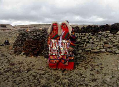 瑪旁布姆卡是西女國女王居住的城堡,普蘭縣文化局局長加措根據(jù)藏文大字典和《阿里史地探秘》的“瑪旁布莫卡”,解釋出“布”的漢文詞義,就是女人、女性、女子或者女王。“莫”就是香草或者香草遍布此山。據(jù)當(dāng)?shù)匕傩战榻B,城堡遺址坐落在普蘭神湖瑪旁雍措湖的東部扎藏布溫泉溝南側(cè)的野嶺上,海拔5000米上下。在遺址上部高處還有一個碩大蘑菇形狀的巖石巋然迎風(fēng)屹立城堡上方,與下方城堡遺址交相輝映。這即是“出俞石、朱砂、麝香、牦牛、駿馬、蜀馬,尤多鹽,恒將鹽向天竺興販,其利數(shù)倍”西女王國的王城。在城堡上方更高處的山后,遺留有眾多的洞穴,說明女國的百姓就居住在女王的周圍。此外在山坡的下方扎藏布溝處,當(dāng)?shù)匕傩辗Q這塊地方為“卡爾青”,意思是大城堡之地。盡管史書上的記載十分有限,瑪旁布姆卡的故事仍然世世代代流傳在當(dāng)?shù)匕傩盏男闹?。霍爾村一位年邁的老百姓告訴筆者,溫泉溝和曲古寺廟附近就有許許多多女王的傳說,聽說女王曾經(jīng)在此沐浴,但不知具體在什么地方。
