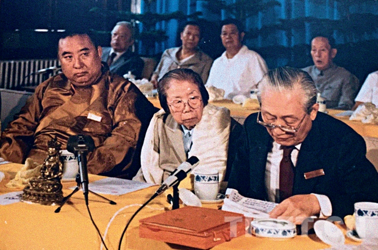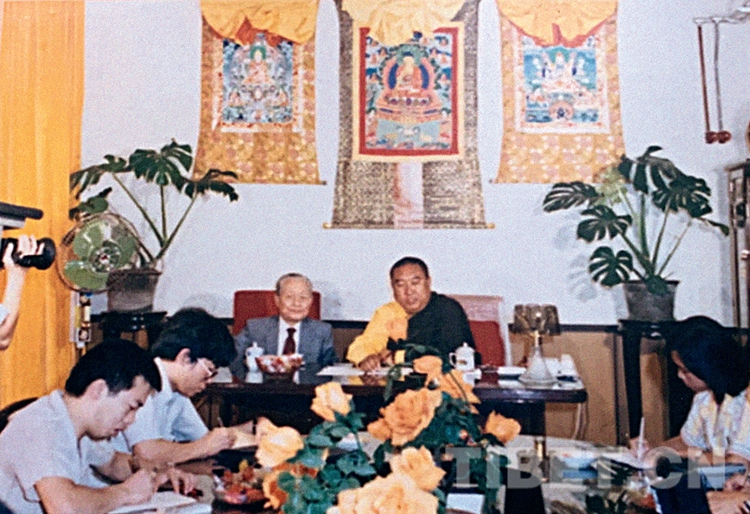 十世班禪和趙樸初顧問在中國(guó)藏語系高級(jí)佛學(xué)院成立儀式新聞發(fā)布會(huì)上接受媒體采訪。中國(guó)藏語系高級(jí)佛學(xué)院提供