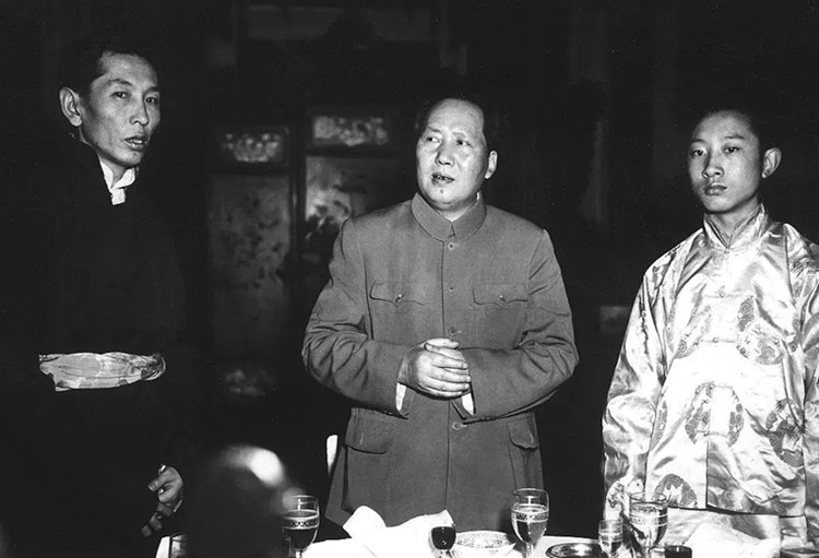中央人民政府主席毛澤東設(shè)宴祝賀“十七條協(xié)議”的簽訂。毛主席在宴會上致辭。右為十世班禪,左為西藏地方政府首席全權(quán)談判代表阿沛·阿旺晉美。