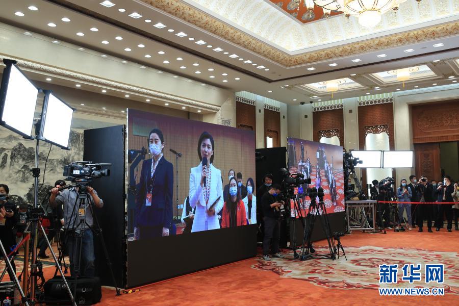 3月10日,全國政協(xié)十三屆四次會議在北京人民大會堂新聞發(fā)布廳舉行第三場“委員通道”采訪活動。這是記者(屏幕中手持話筒者)通過網(wǎng)絡(luò)視頻方式提問。新華社記者 王南 攝