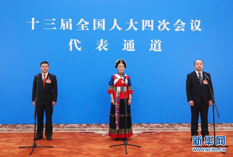 3月8日,第十三屆全國人民代表大會第四次會議舉行第二場“代表通道”采訪活動。這是全國人大代表?xiàng)钫鹕?、范永貞、齊嵩宇(從左至右)通過網(wǎng)絡(luò)視頻方式接受采訪。