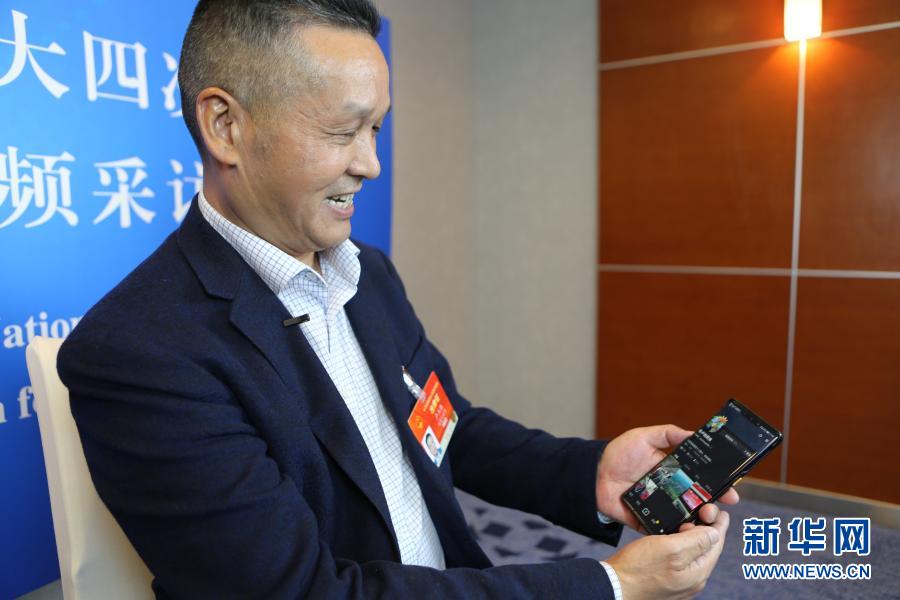 3月3日,全國人大代表、福建永泰縣希安油茶專業(yè)合作社負責人盧玉勝在駐地接受采訪時展示他為宣傳油茶開通的社交媒體賬號。新華社記者 吳雨 攝