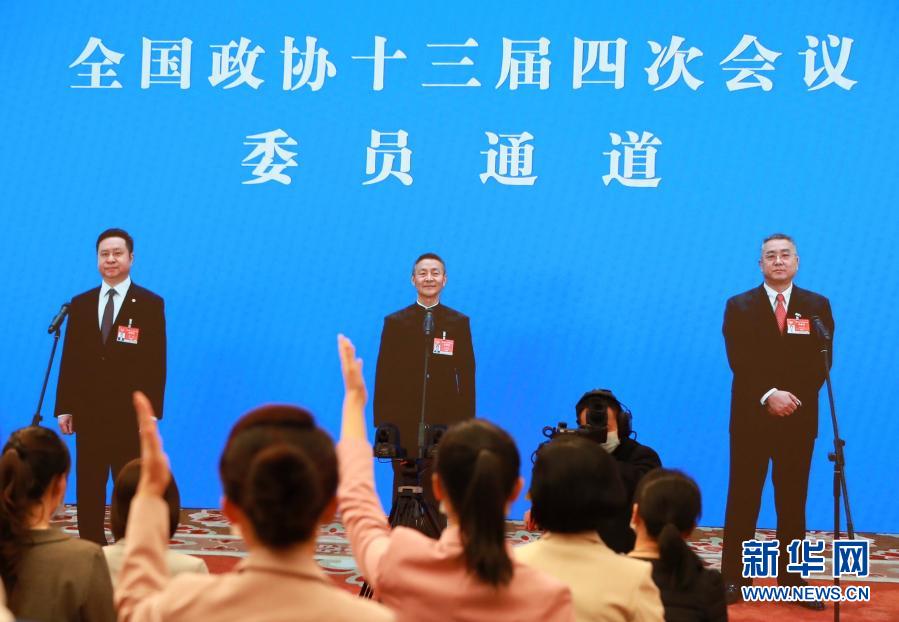 3月10日,全國政協(xié)十三屆四次會議在北京人民大會堂新聞發(fā)布廳舉行第三場“委員通道”采訪活動。這是記者(屏幕中手持話筒者)通過網(wǎng)絡視頻方式提問。新華社記者 王南 攝