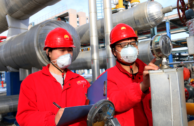 塔里木油田公司的兩名青年職工在氣田巡檢。