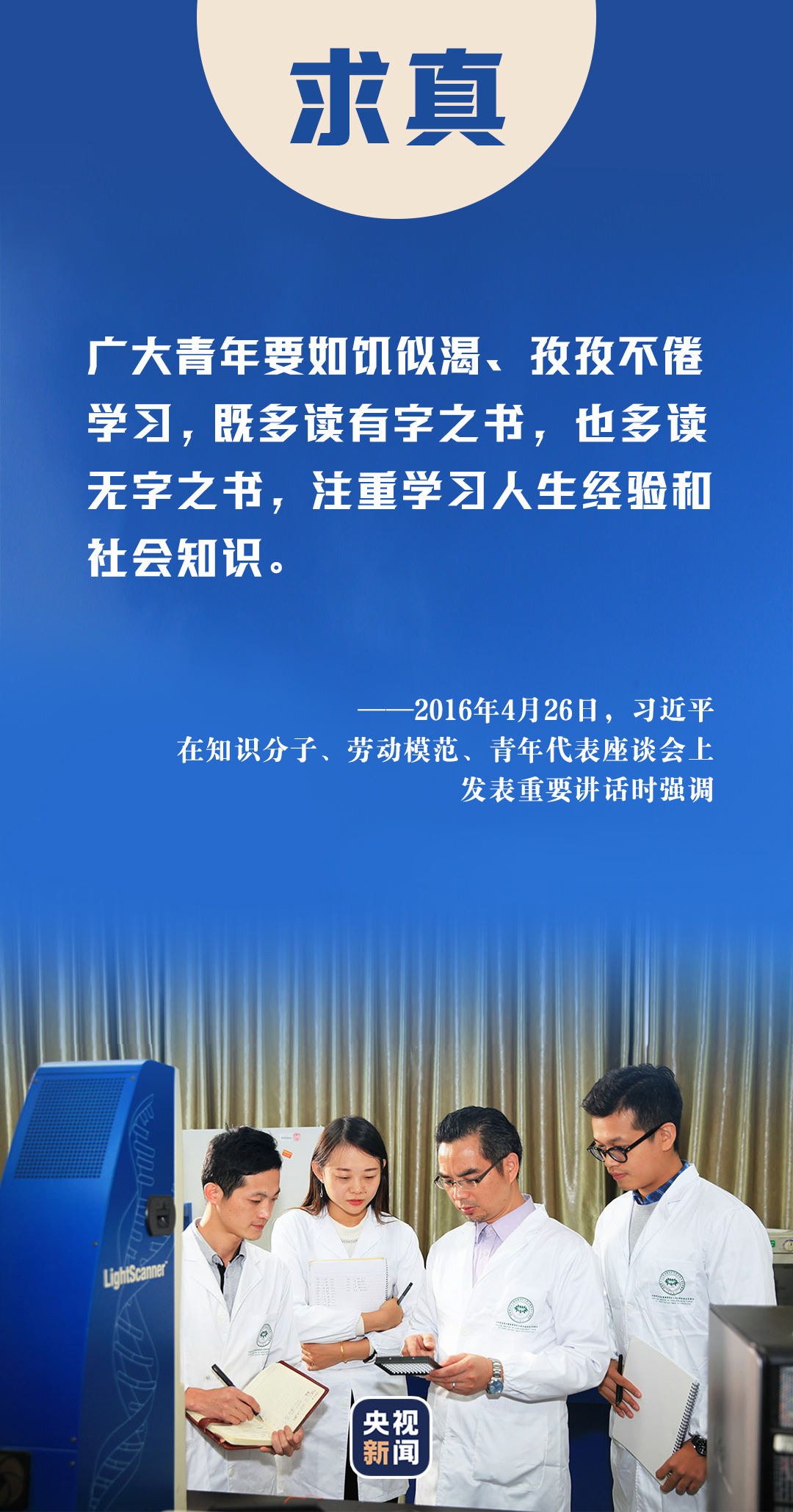 2013年五四青年節(jié),習近平總書記來到中國航天科技集團公司中國空間技術研究院,與青年代表座談??倳浿赋?,廣大青年要堅持面向現代化、面向世界、面向未來,增強知識更新的緊迫感,如饑似渴學習,既扎實打牢基礎知識又及時更新知識,既刻苦鉆研理論又積極掌握技能,不斷提高與時代發(fā)展和事業(yè)要求相適應的素質和能力。
