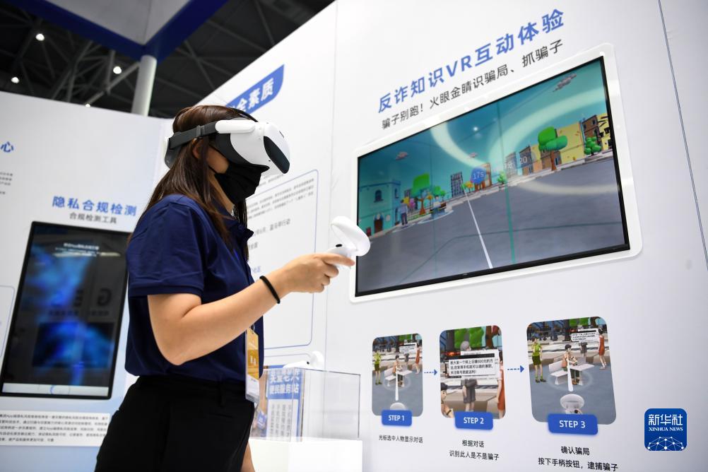 一家參展企業(yè)代表在2022年國家網(wǎng)絡(luò)安全宣傳周網(wǎng)絡(luò)安全博覽會上演示反詐知識VR互動體驗項目(2022年9月4日攝)。新華社記者 劉軍喜 攝