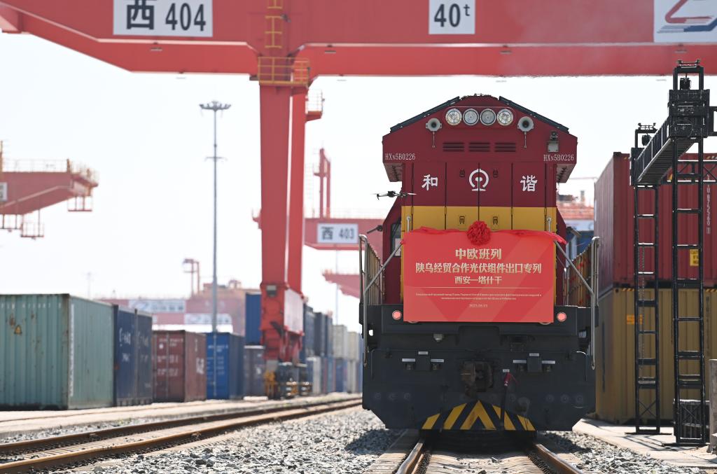 8月3日,中歐班列(西安-塔什干)陜?yōu)踅?jīng)貿(mào)合作隆基綠能光伏組件出口專列在西安國際港站準(zhǔn)備發(fā)車。新華社記者 鄒競(jìng)一 攝