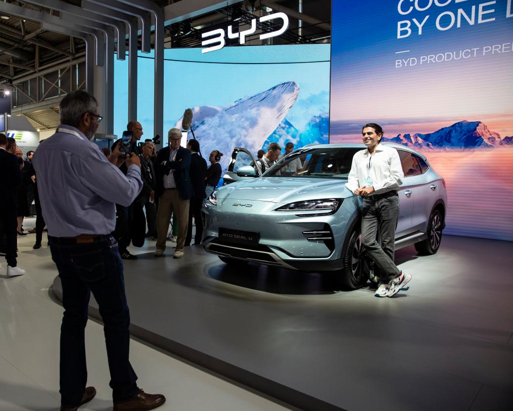 9月4日,在德國慕尼黑國際車展媒體預(yù)展上,參觀者在比亞迪品牌發(fā)布會(huì)現(xiàn)場(chǎng)與BYD SEAL U汽車合影。新華社記者 張帆 攝